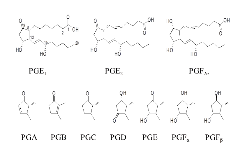 2. 五元脂环上因含取代基=O(羰基)和-OH(醛基)的不同及双键的位置不同,PG分为A、B、C、D、E、F等,用PGA等表示。
