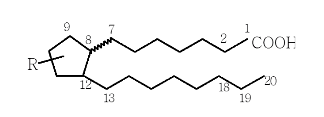 前列腺素是存在于动物和人体中的一类不饱和脂肪酸组成的、具有多种生理作用的活性物质,其母体化合物为前列腺酸,由一个环戊烷和两个脂肪族侧链组成。